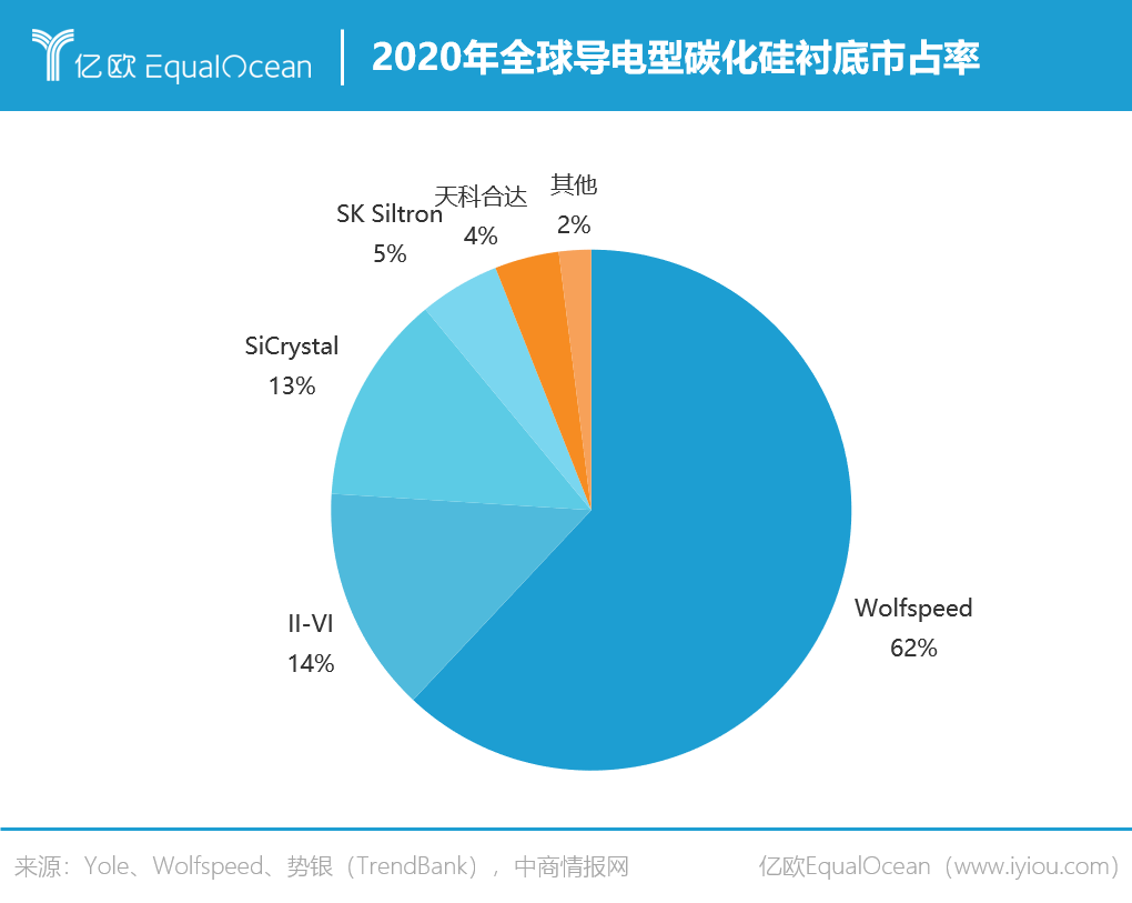 除此之外,在导电型碳化硅衬底方面,虽然在2020年底美国的Wolfspeed依旧一家独大,市占率高达62%,但II-VI、SiCrystal、SKSiltron、天科合达等企业也成功占领了部分市场份额。