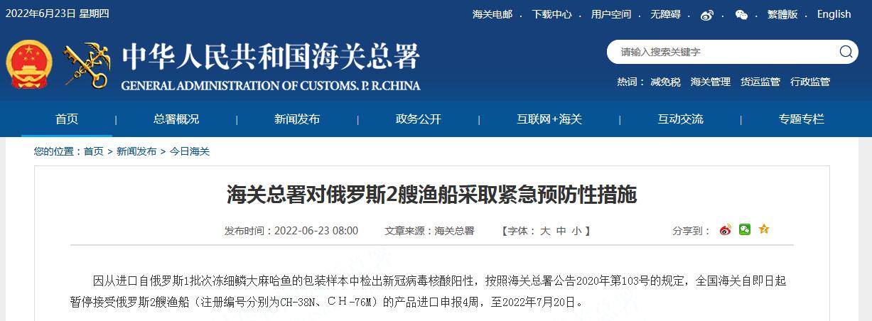 因从进口自俄罗斯1批次冻细鳞大麻哈鱼的包装样本中检出新冠病毒核酸阳性,按照海关总署公告2020年第103号的规定,全国海关自即日起暂停接受俄罗斯2艘渔船(注册编号分别为CH-38N、СН-76M)的产品进口申报4周,至2022年7月20日。
