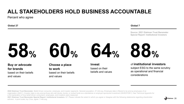 投资者、消费者和员工对ESG的热情会受社会形势、ESG形势的影响而变化,领导人要接受这一点。只要你的ESG策略有利于公司发展,不被大环境看好时也要咬牙坚持。爱德曼2022年信任晴雨表报告(Edelman 2022 Trust Barometer)里写过,即使在经济困难时期,投资者仍然青睐关注社会责任的品牌和公司。