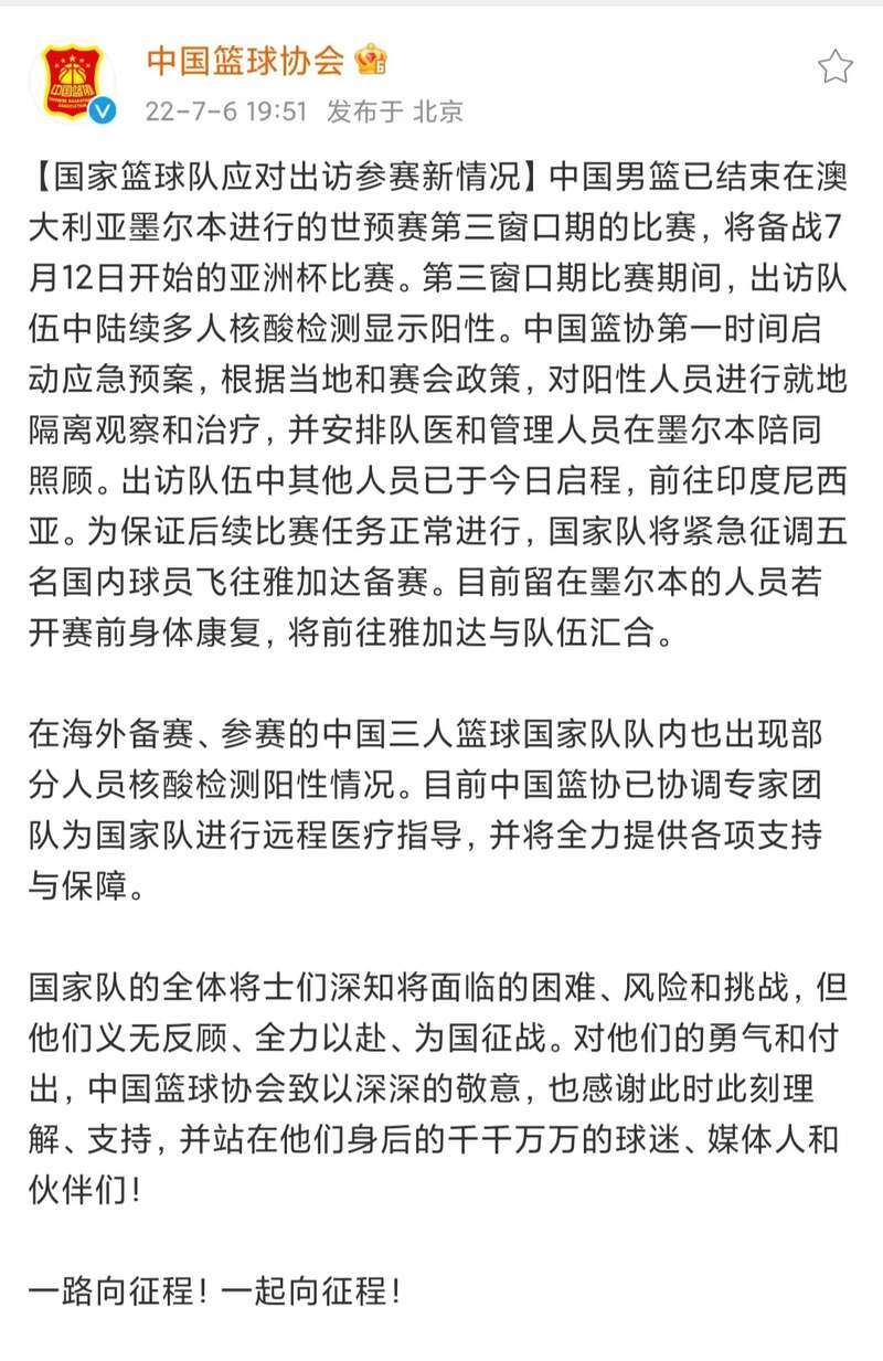 经中国篮协确认,正在国外征战的中国男篮多人核酸阳性,为完成接下来征战男篮亚洲杯的任务,中国篮协已经紧急征调多人前往雅加达。