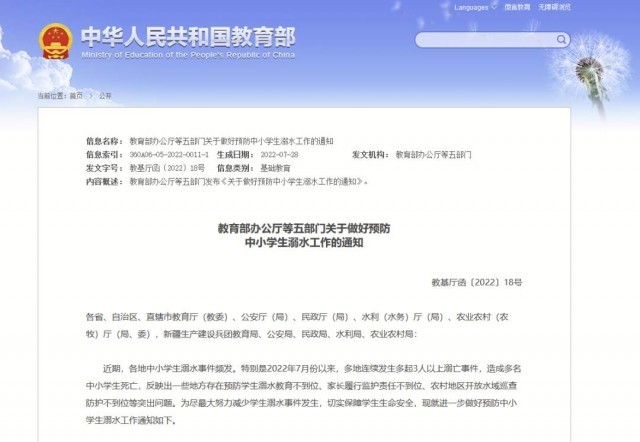 教育部办公厅等五部门关于做好预防中小学生溺水工作的通知