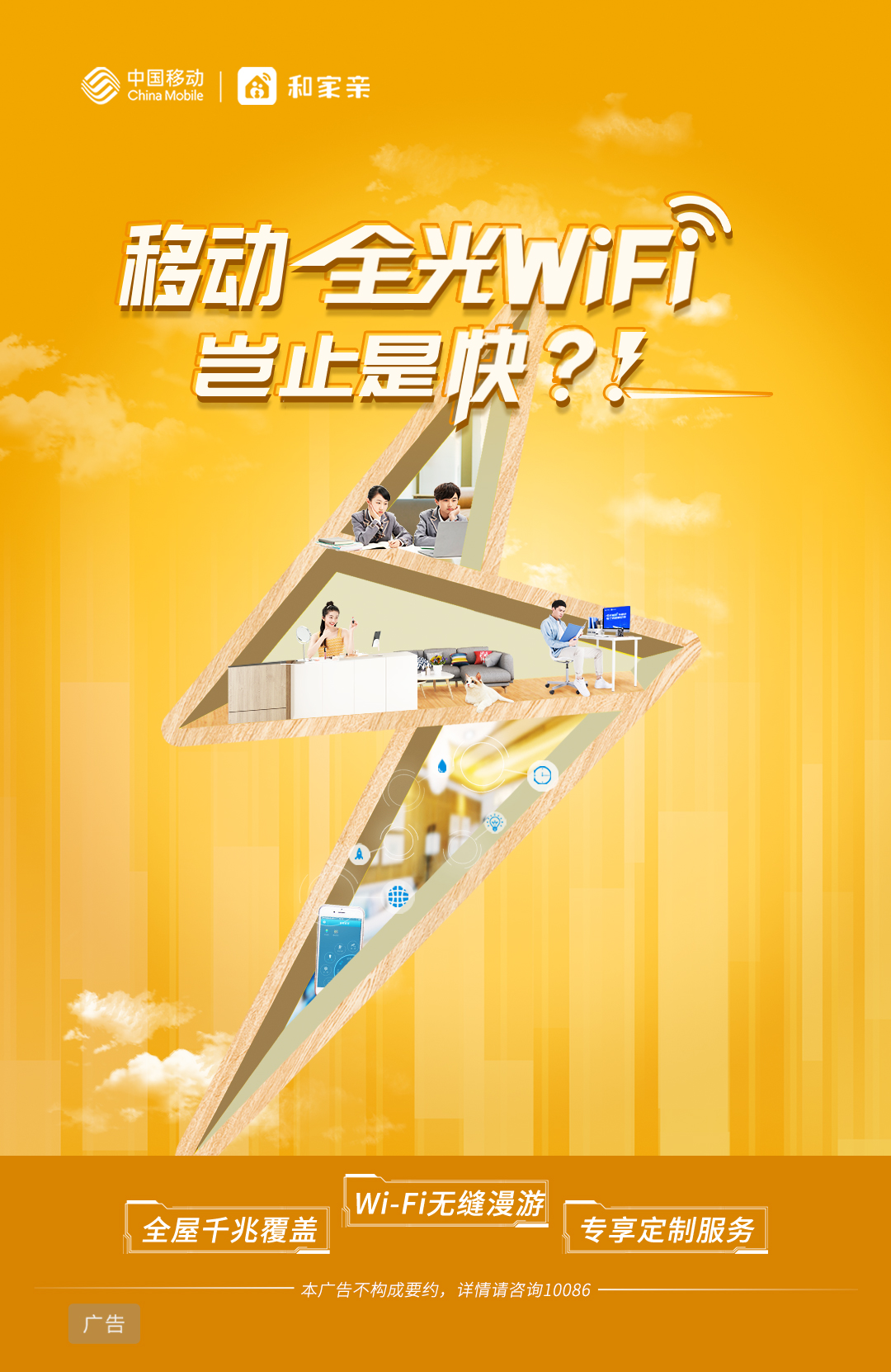 中国移动全光WiFi解决方案,在光纤到达每个房间的基础上,通过丰富的全光组件和灵活极简的组网模式,将超千兆的Wi-Fi网络覆盖到家庭的每个房间,满足年轻群体的高带宽、低时延、多联接、无感知上网需求。