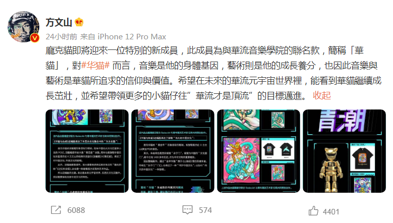 7月25号,国风音乐大师方文山以“华流元宇宙”活动的“国风潮流推荐官”在微博发布了4幅《华猫X山海经》潮流艺术画作,致敬和传播“伟大中国风文化”,超燃的创作理念,引发了一片好评,该系列画作在潮流中国、长安IN、上链购、青潮星选等进行多平台联合发售,引发抢购热潮,甚至有“外国友人”专门在上链购咨询开户购买,获央媒和网友的肯定与点赞:“这才是真正在传播中国风,华流才是顶流...”。