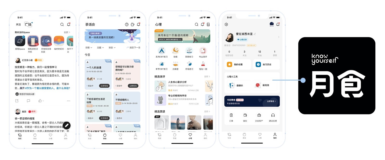 月食App承载了「CBT练习」「冥想」「心理测评」「茶话会」「聊愈」「互助型社区社交」「心理小游戏」「白噪音」等多种功能模块,从自助、互助、专业帮助三个维度出发,为使用者提供全面而科学的心理帮助。