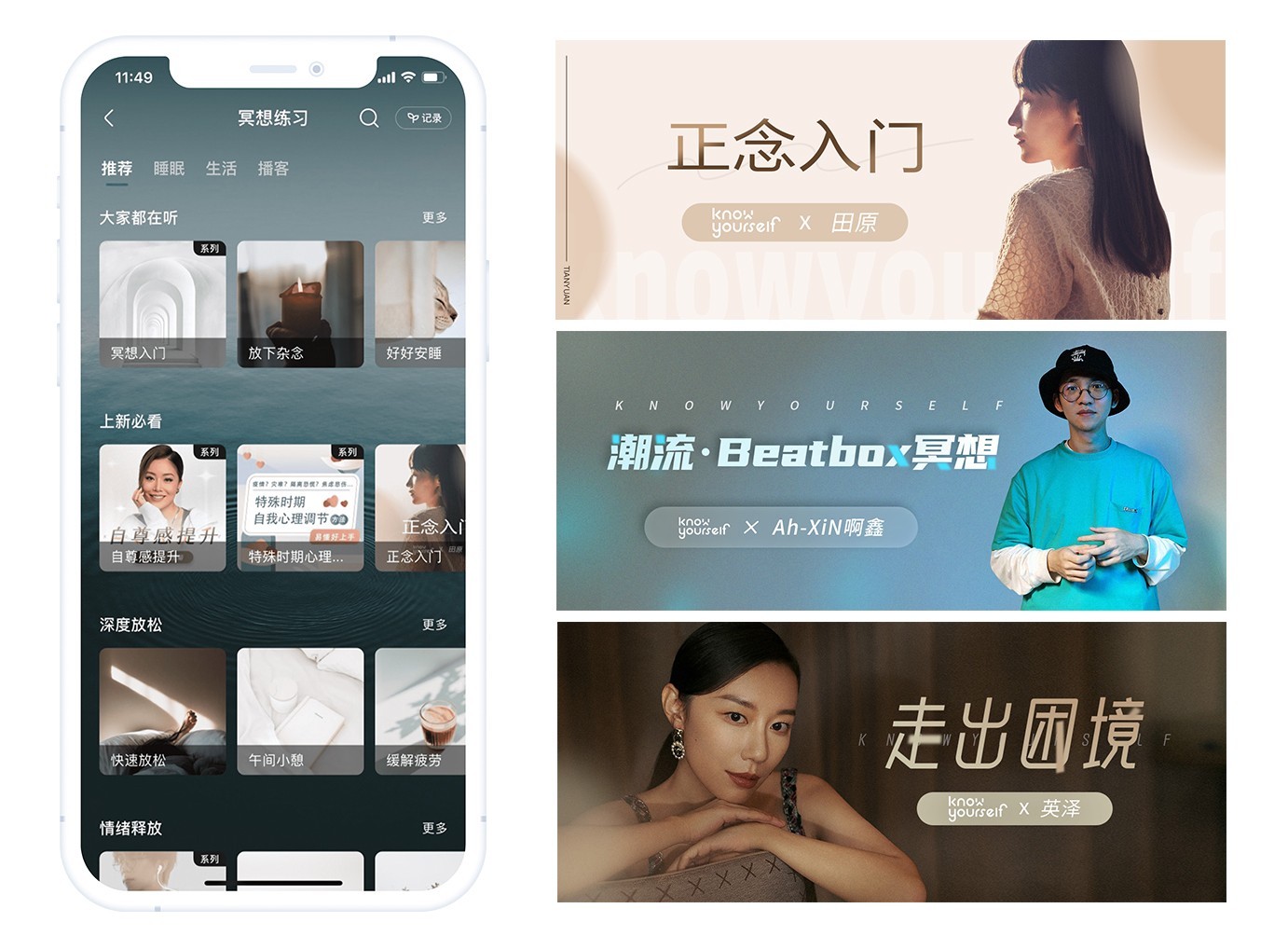 同时KY在冥想音频领域正探索更多方向。与歌手陈鸿宇共同合作的「轻松·冥想情绪包」通过系列练习帮助人们快速开启放松减压之旅,演员田原合作的「正念入门」系列则从0到1帮助人们快速掌握正念七大法则,还有青年演员英泽倾情录制的「走出困境」系列、潮流Beatbox、电音唱颂等明星合作系列。