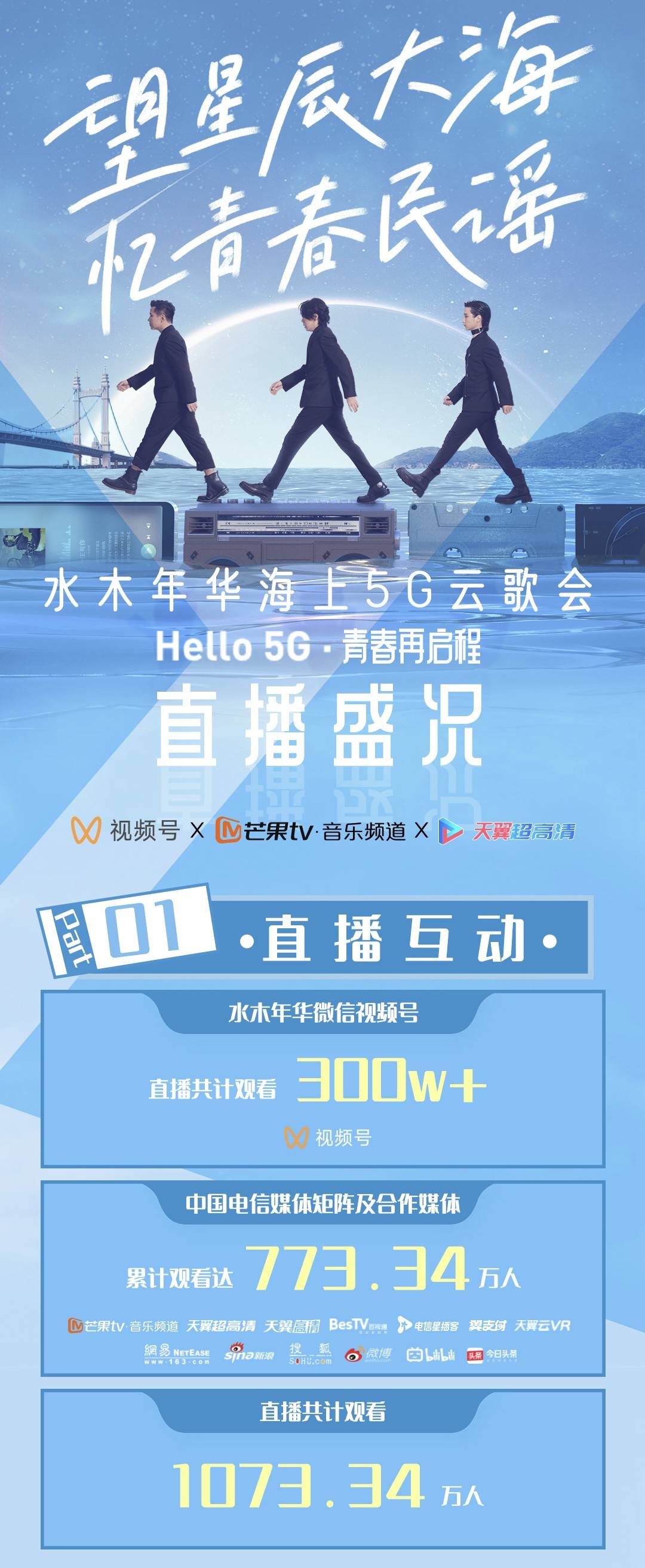 当晚,直播观看人次累计破千万,达1073.34万人次。#水木年华谁的青春上线了#、#水木年华海上5G云歌会#、#那可是水木年华啊#等微博话题引发热议,抖音话题挑战赛#挑战水木年华花式唱启程#播放近千万。传播触达人次破亿。