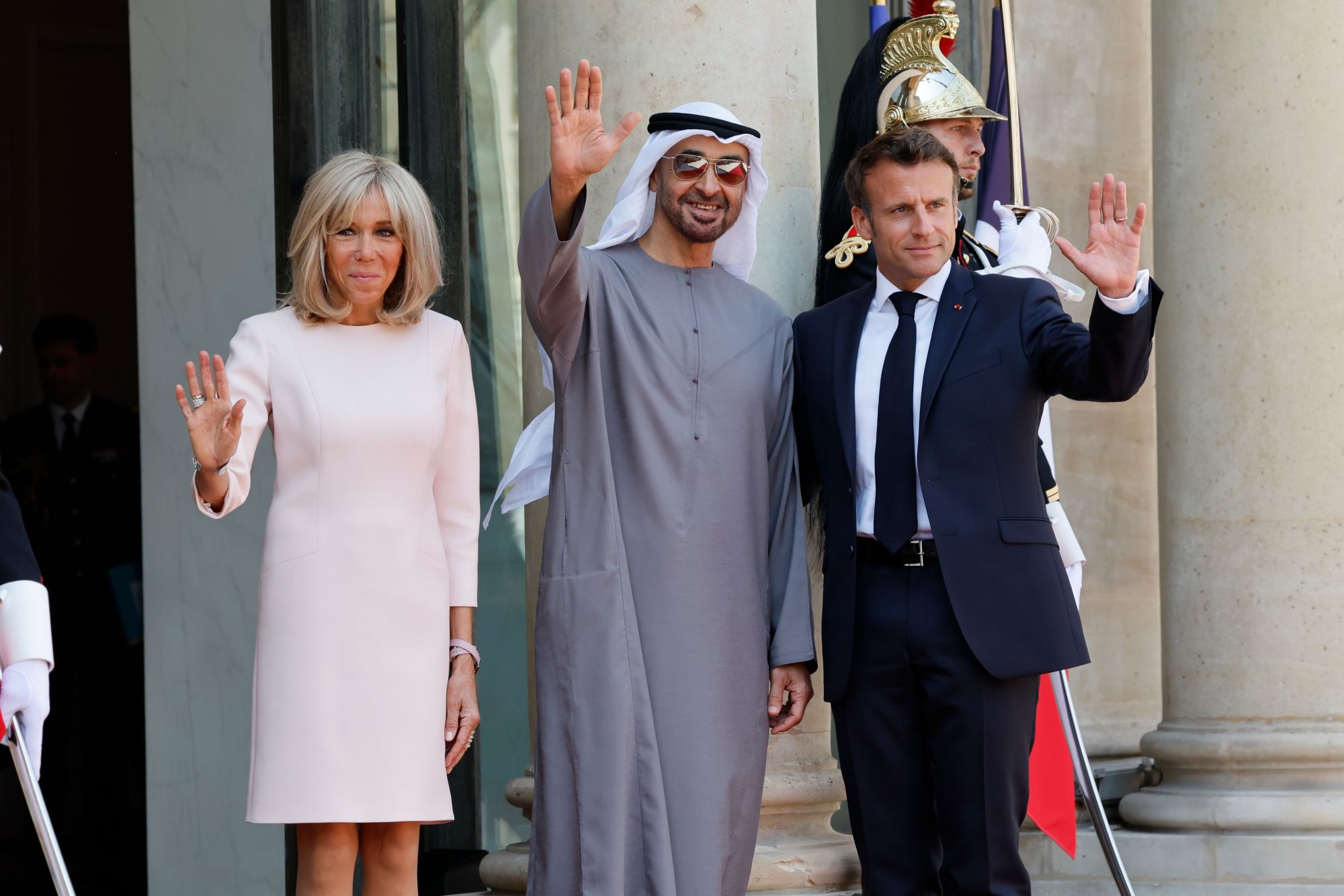 7月18日,法国总统马克龙(右)和夫人布丽吉特在巴黎总统府爱丽舍宫迎接到访的阿拉伯联合酋长国总统穆罕默德(中)。(新华社发,里特·艾斯摄)