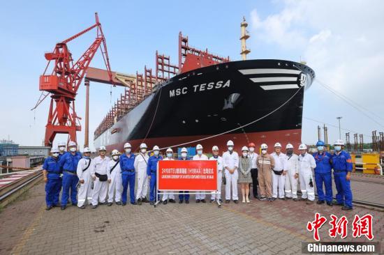 8月1日,中国船舶集团旗下沪东中华造船(集团)有限公司为地中海航运公司(MSC)建造的24116TEU超大型集装箱船在长兴造船基地顺利出坞。这是迄今为止全球建造的首艘最大装箱量集装箱船,也是继今年6月22日完工交付中国首艘全球最大24000TEU超大型集装箱船,沪东中华在全球顶级超大型集装箱船建造领域创下的又一项新纪录,标志着世界超大型集装箱船建造进入中国船舶引领的新纪元。图为24116TEU超大型集装箱船在长兴造船基地顺利出坞。