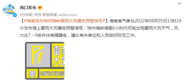 海南省气象台2022年08月05日13时24分发布海上雷雨大风黄色预警信号:琼州海峡海面6小时内可能出现雷雨大风天气,风力达7~9级并伴有强雷电,建议有关单位和人员做好防范工作。