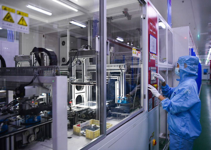 2022年7月19日,工作人员在位于陕西西安的隆基绿能科技股份有限公司单晶硅太阳能电池工厂内调试设备。新华社记者 张博文 摄