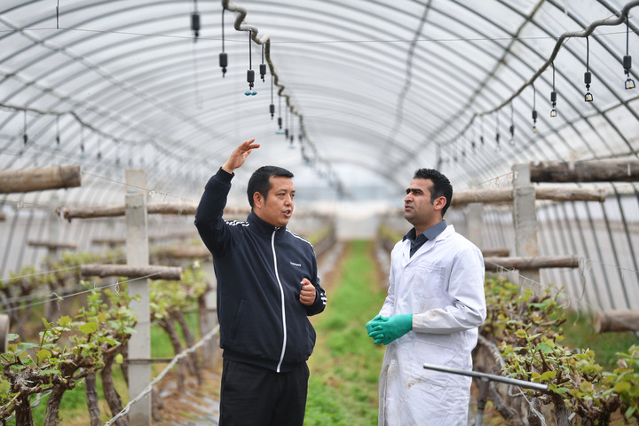 2021年3月17日,来自巴基斯坦的留学生(右)在陕西杨凌锦田农业专业合作社向当地职业农民了解水肥一体化灌溉设备。新华社记者 张博文 摄