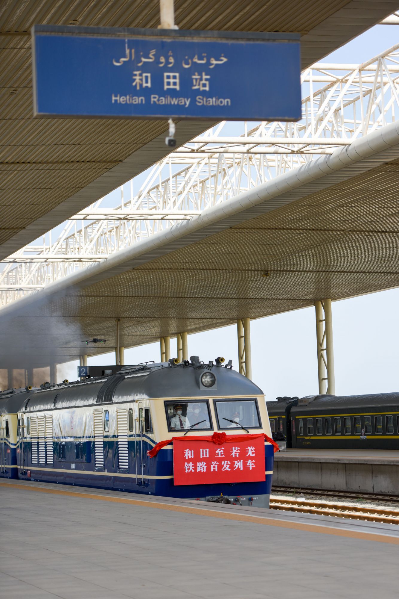 和田至若羌铁路首趟列车驶出新疆和田火车站(2022年6月16日摄)。新华社记者 丁磊 摄
