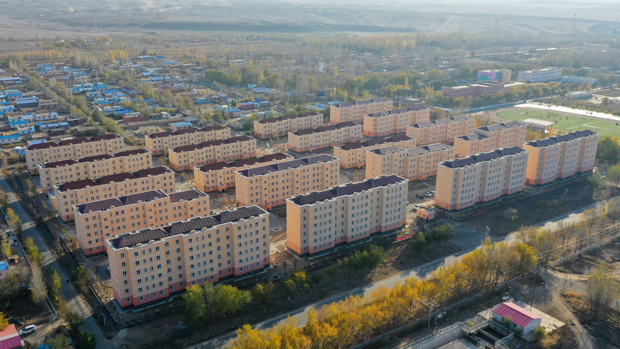 这是新疆昌吉市阿什里乡天鹅小镇(无人机照片,2020年10月16日摄)。天鹅小镇是由福建援疆泉州分指挥部支援建设的牧民定居项目。新华社记者 丁磊 摄