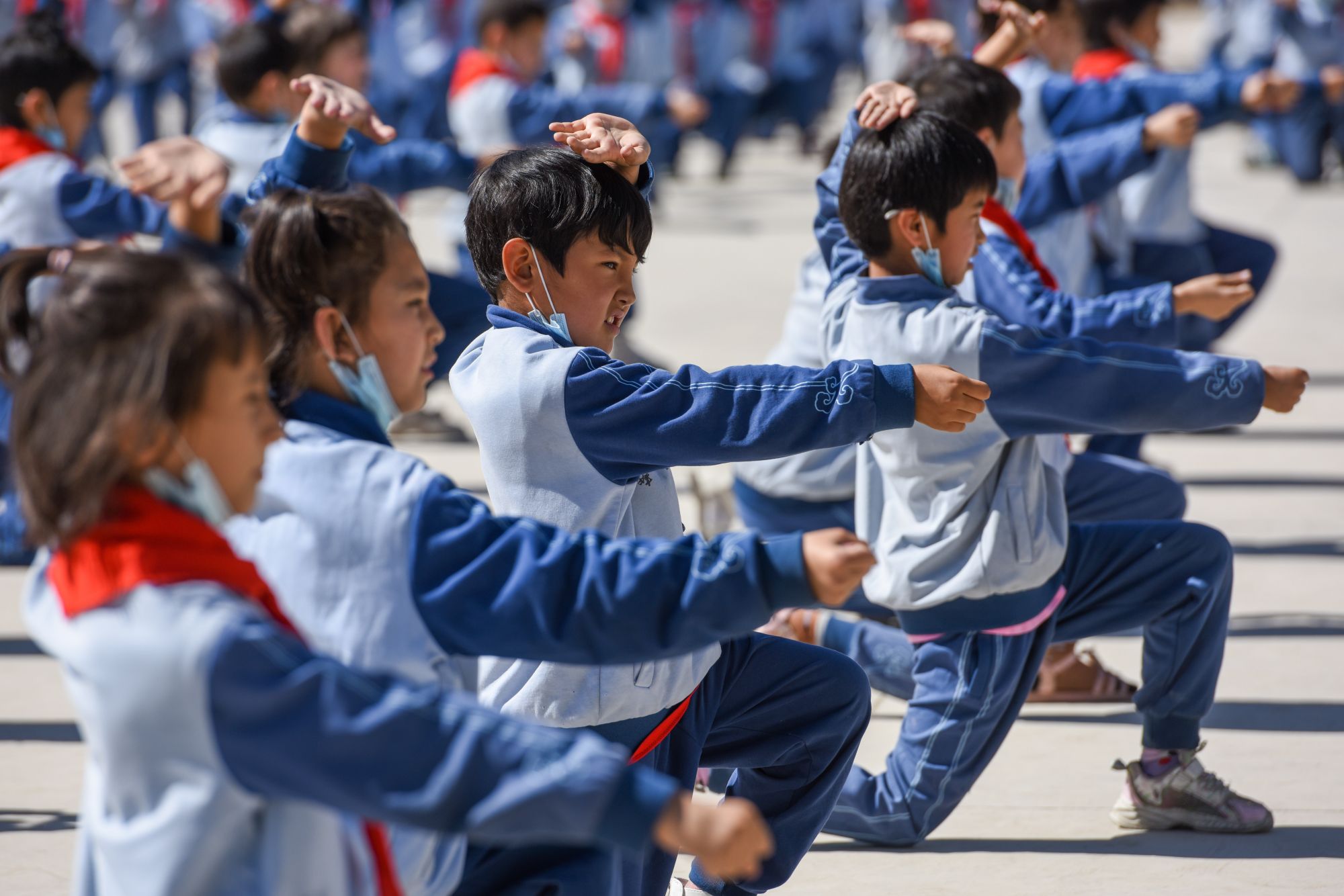 在新疆阿克苏地区乌什县依麻木镇国家通用语言小学,学生们在做课间操(2022年6月8日摄)。新华社记者 丁磊 摄