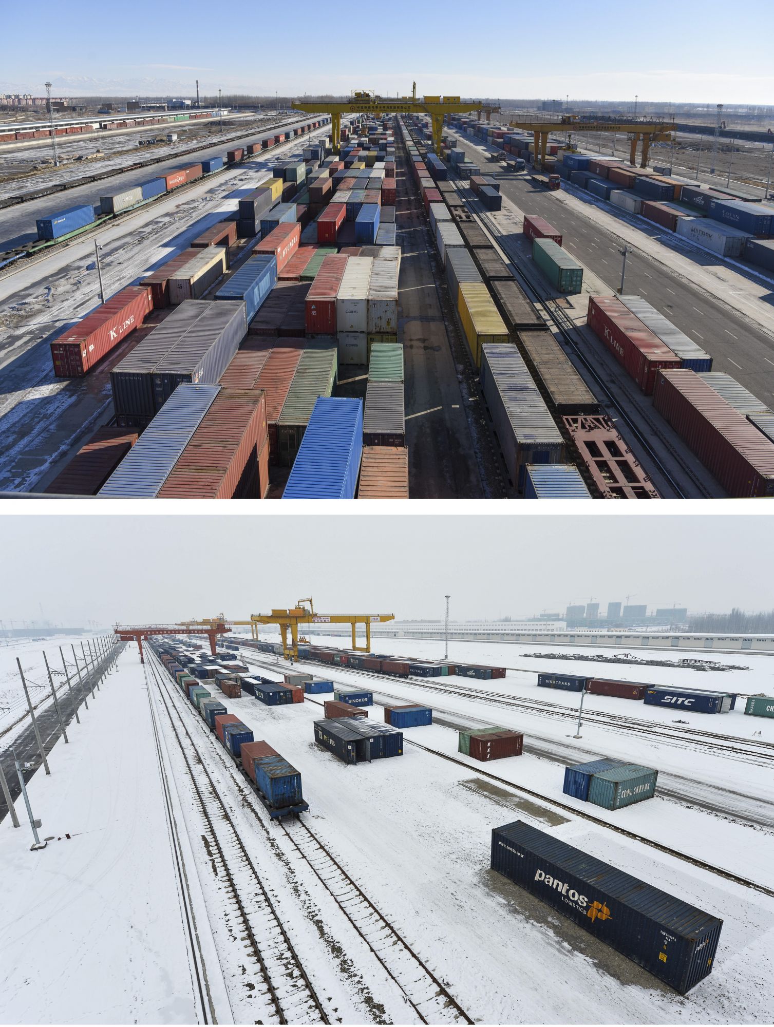 拼版照片:上图为2021年2月6日拍摄的新疆霍尔果斯铁路口岸换装场内的换装作业场景(新华社记者 丁磊 摄);下图为2013年12月25日拍摄的新疆霍尔果斯火车站换装场(新华社记者 江文耀 摄)。新华社发