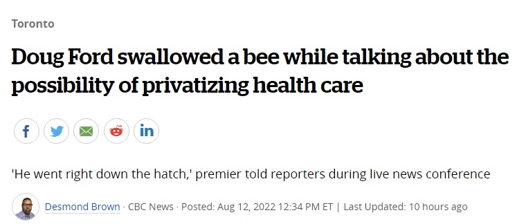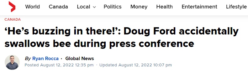 报道称,当时福特正接受记者提问、谈到安大略省的医护人员短缺等问题,一只蜜蜂就在其脸边盘旋,他还试图用手驱赶。但随后,蜜蜂飞进了福特嘴里。