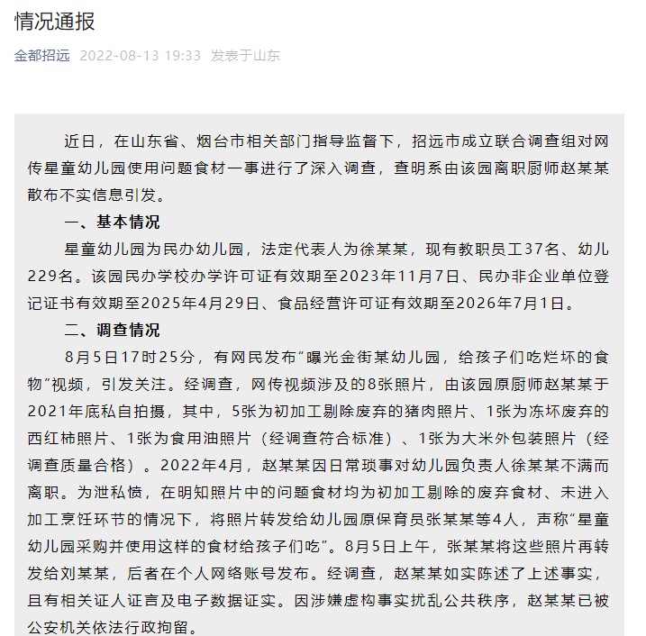 近日,在山东省、烟台市相关部门指导监督下,招远市成立联合调查组对网传星童幼儿园使用问题食材一事进行了深入调查,查明系由该园离职厨师赵某某散布不实信息引发。