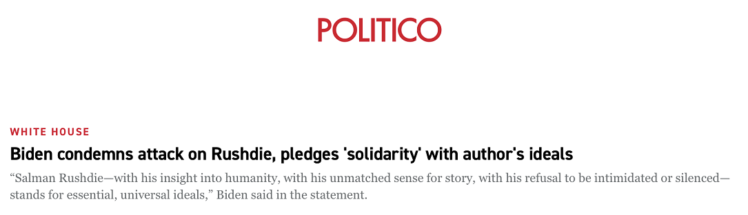 综合政治新闻网报道及白宫网站发布的消息,拜登在一份针对此事的声明中称:“吉尔(第一夫人)和我得知昨天在纽约发生的对萨尔曼·拉什迪的恶毒攻击后感到震惊与悲痛”,“我们与所有美国人和世界各地的人们一起,为他(拉什迪)的健康与康复祈祷。”