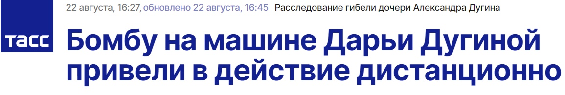 另据俄新社22日报道,俄联邦安全局发布消息称,杜金娜遇害案是乌克兰相关部门策划和实施的,具体行动的执行者是一名乌克兰公民,其对杜金娜所驾驶的汽车实施爆炸后逃往爱沙尼亚。
