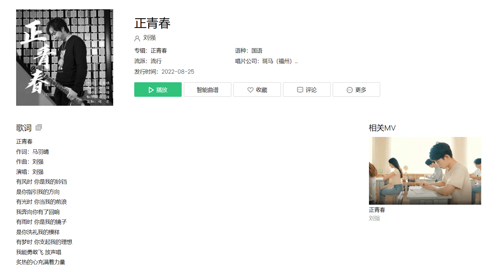 8月25日,由歌手刘强演唱的原创歌曲《正青春》正式发行上线。《正青春》是由马羽晴作词,刘强作曲,佐志监制,刘强制作并演唱的歌曲。