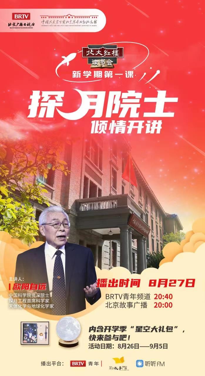 2022年秋季开学之际,《北大红楼读书会》推出新学期第一课,欧阳自远院士来到了五四时期传播“德先生 “赛先生”的北大红楼原大教室的讲台,为青年人倾情讲述“国家的发展培育我成长”。节目于8月27日20:00在北京故事广播、20:40在BRTV青年频道播出,听听FM同步呈现。