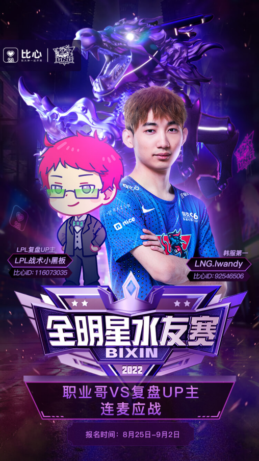 想要参与水友赛的粉丝,可于8月25日―9月2日登录比心APP报名,入选的粉丝将在9月9日,获得与两位队长一起决战召唤师峡谷的机会。