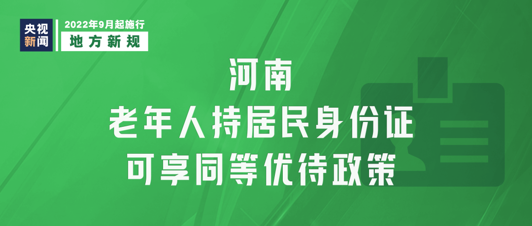 河南省下发《关于做好以身份证替代老年人优待证工作的通知》,9月1日起,持有老年人优待证或本人居民身份证的老年人,同等享受优待政策与服务。