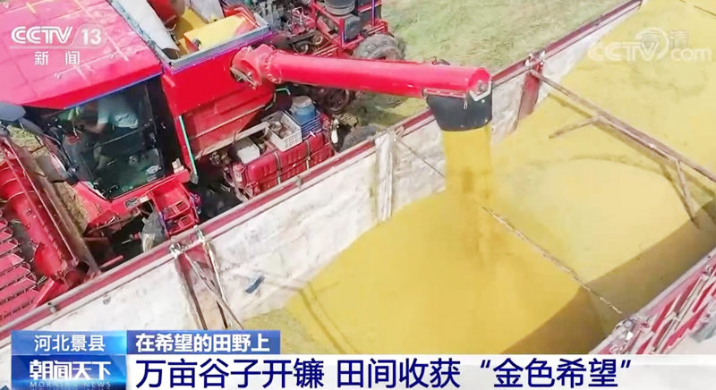 在河北省景县,一万多亩谷子进入了成熟季节。多台联合收割机来回穿梭,金黄色的谷粒从收割机的传送筒中倾泻而下,一派丰收的喜人景象。