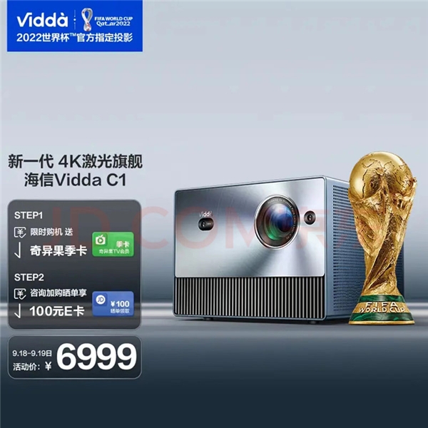 作为微投行业1%的存在,作为2022世界杯官方指定投影,Vidda C1用震撼人心的色彩和亮度收获每一个用户的青睐和肯定,目前某东活动价6999,还限时购机送奇异果季卡,咨询加购晒单还可以享100元E卡,千元价格,万元画质,新一代4K激光旗舰海信Vidda C1 ,你值得拥有。