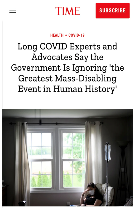 △《时代》周刊报道,专家称“长新冠”是人类历史上最大的“致残事件”,而美国政府并未给予足够的重视