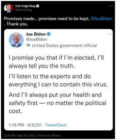 美国传染病学家埃里克19日在推特上贴出了拜登竞选美国总统时的一则推文:“我承诺,如果我当选,我会告诉你们真相。我会听从专家的建议,尽一切努力遏制新冠病毒。我会永远把你们的健康和安全放在第一位,不管政治代价有多大。”埃里克专门@拜登并提醒称:“承诺已做出…… 需要被履行,拜登总统。谢谢。”↓