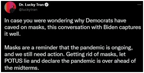 至于拜登为何发表这样的言论,“为科学游行”(March for Science)活动的组织者、哥伦比亚大学的科学传播者Lucky Tran博士认为可能是受到了中期选举的影响。他在推特上发文称:“口罩提醒人们,大流行仍在继续,我们仍然需要采取行动。要摘掉口罩,就需要美国总统撒谎,在中期选举前谎称大流行已经结束了。”↓