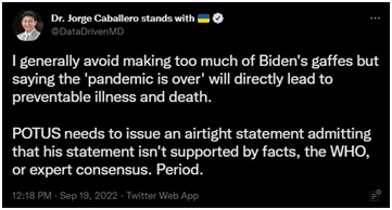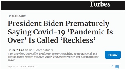 福布斯的报道认为,拜登言论传达的错误信息反而可能会误导民众不采取正确措施进行预防和治疗,从而导致更多本来可以避免的确诊、死亡病例。《纽约时报》的数据显示,截至9月19日,美国平均每天有超过460人因新冠死亡,超过3.1万人因新冠住院。美国斯坦福大学医学院临床讲师豪尔赫·卡巴莱罗19日发推说:“我通常不对拜登的失言作过多评论,但说‘疫情已结束’将直接导致(本来)可预防的确诊和死亡病例的发生。总统需要发表明确的声明,承认他的说法没有事实依据、世界卫生组织或专家共识的支持。”↓