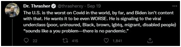 此外,美国记者、《病毒与下层阶级:人类在不平等和疾病碰撞时付出的代价》一书的作者史蒂文·思拉舍博士在19日连发数推,批评拜登言论“鲁莽”且“不负责任”:“我认为我的一生中,从未见过比拜登宣布疫情(结束)更为鲁莽、更不负责任的国内政策,每周还有数千(美国)人因此死亡,每月有数十万人因此感染。”“目前为止,美国是世界上疫情最严重的国家,而拜登并不满足于此。他想让事情变得更糟。”↓