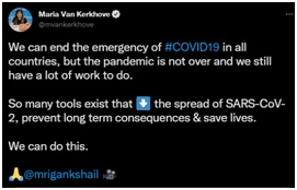 报道称,就在拜登18日发表“疫情已结束”言论的前两天,世卫组织卫生紧急项目技术负责人玛丽亚·范克尔克霍夫16日在推特发文,陈述了一个和拜登说法完全相反的事实。她写道:“我们可以结束所有国家的紧急状态,但新冠肺炎疫情没有结束,我们仍有很多工作要做。”↓