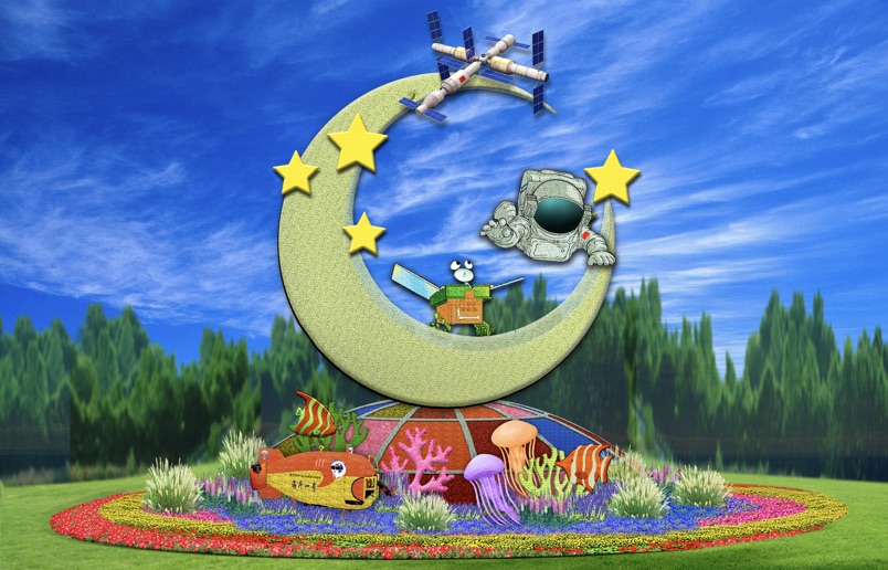 东单东北角布置“创新发展”花坛,花坛顶高9.5米,以宇航员遨游太空和海斗号探索海洋为主景,配以中国空间站、玉兔号月球车等,寓意全面贯彻新发展理念,深入实施创新驱动发展战略,加快建设科技强国,实现高水平科技自立自强。