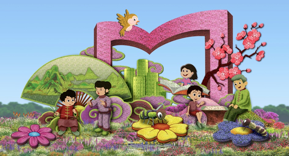 东单西北角布置“开放发展”花坛,花坛顶高8.5米,以货轮、中欧班列、纽带及四大经贸会标志(广州广交会、北京服贸会、上海进博会、海南消博会)为主景,寓意构建国内国际双循环相互促进的新发展格局,推进高水平对外开放。