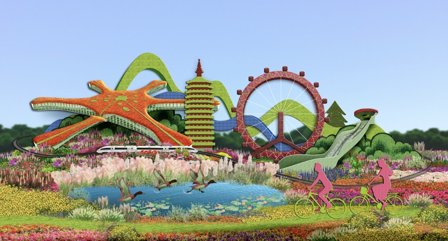 东单东南角布置“协调发展”花坛,花坛顶高10.5米,以京津冀三地代表建筑(大兴国际机场、燃灯塔、天津之眼、雪如意)为主景,轨道列车环绕其间,寓意京津冀协同发展,疏解非首都功能,推动雄安新区和城市副中心“两翼”联动发展,构建现代化首都都市圈,共同描绘美好未来新篇章。