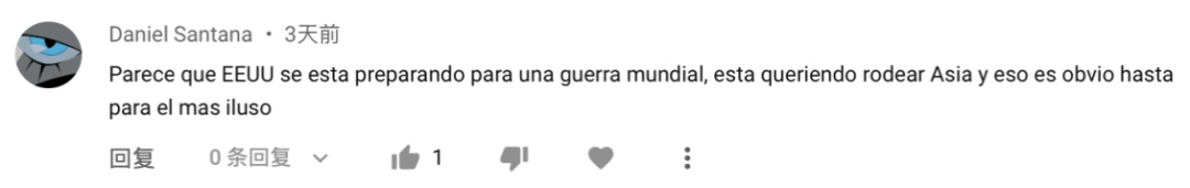 西班牙语网友丹尼尔:“美国正在筹备一场世界大战,企图围堵亚洲,这已是昭然若揭。”