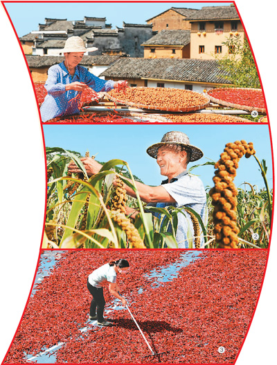 图①:9月19日,安徽省黄山市歙县阳产村的村民在土楼前晾晒农作物。