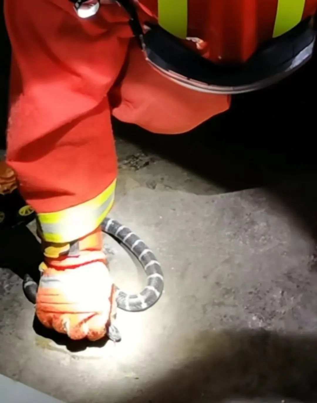 资料图:消防员接到求助,到居民家中抓捕银环蛇。来源:铜仁消防视频截图