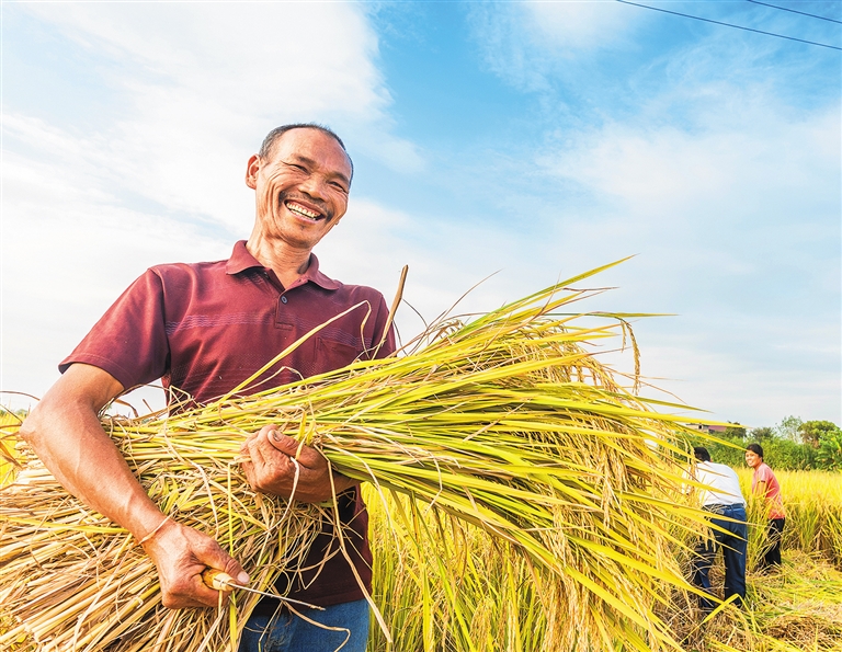 9月23日,江西省樟树市经楼镇神岭村村民捧着沉甸甸的水稻,笑得合不拢嘴。今年该市中稻种植面积达5.86万亩,喜获丰收。简俊摄(中经视觉)