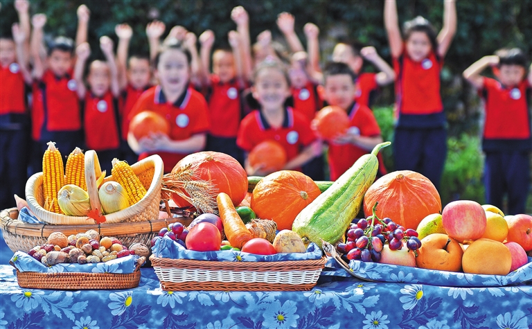 9月22日,山东省烟台市福山区实验幼儿园的小朋友参加中国农民丰收节活动。孙文潭摄(中经视觉)