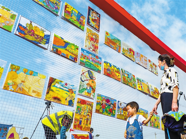 9月23日,安徽省合肥市2022年中国农民丰收节在肥东县桥头集镇开幕,市民在农耕主题绘画展前观看“丰收图”。王尚云摄(中经视觉)