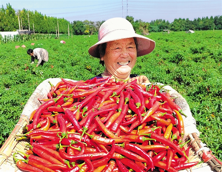 9月23日,村民在河北省邢台经济开发区王快镇河会社区股份经济合作社展示刚采摘的辣椒。赵永辉摄(中经视觉)