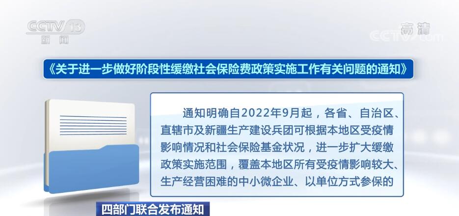 通知明确自2022年9月起,各省、自治区、直辖市及新疆生产建设兵团可根据本地区受疫情影响情况和社会保险基金状况,进一步扩大缓缴政策实施范围,覆盖本地区所有受疫情影响较大、生产经营困难的中小微企业、以单位方式参保的个体工商户、参加企业职工基本养老保险的事业单位及各类社会组织,使阶段性缓缴社会保险费政策惠及更多市场主体。