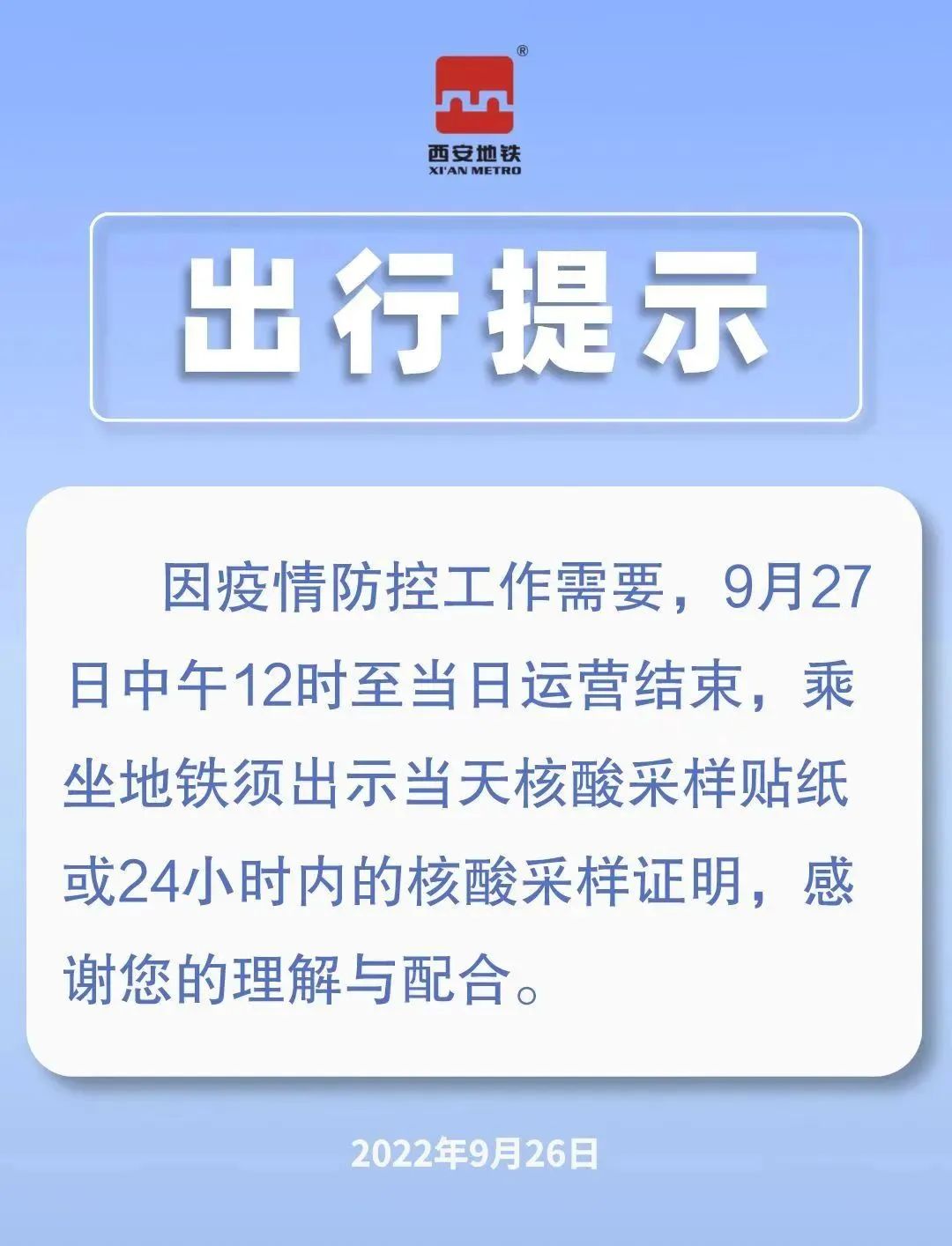 昨日(9月26日),西安地铁发布出行提示:因疫情防控工作需要,9月27日中午12时至当日运营结束,乘坐地铁须出示当天核酸采样贴纸或24小时内的核酸采样证明 ,感谢您的理解与配合。