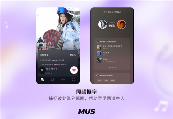 为了让用户更直观地感受与陌生人之间的同频率,MUS首创“同频概率”玩法。它根据用户双方的红心歌曲、曲风及语种偏好等维度,计算双方的同频率。同频率是MUS用户推荐算法的主要考量维度,也成为很多用户选择是否与他人匹配的重要因素。此外,MUS还能根据历史听歌行为数据,解析潜在的性格特质,帮助用户更立体地了解他人。