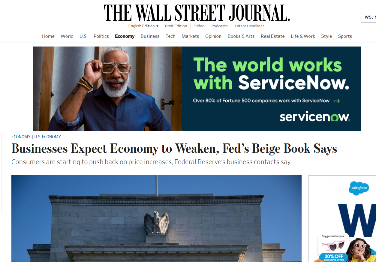 《华尔街日报》报道,美联储“褐皮书”显示企业预计经济疲软