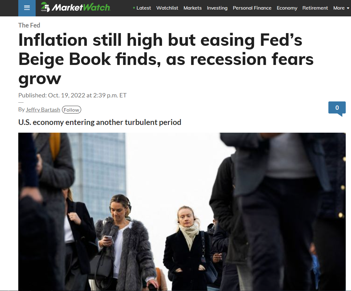 与此同时,美联储为抑制通胀持续激进加息,被市场认为将拖累经济成长,并可能拖累企业利润和市场估值,导致越来越多的华尔街分析人士对股市发表悲观言论,并对市场波动性发出警告。“褐皮书”发布当天,美国股市出现下跌,投资者除了关注企业财报表现,也在对越来越多的经济悲观预测做出反应。